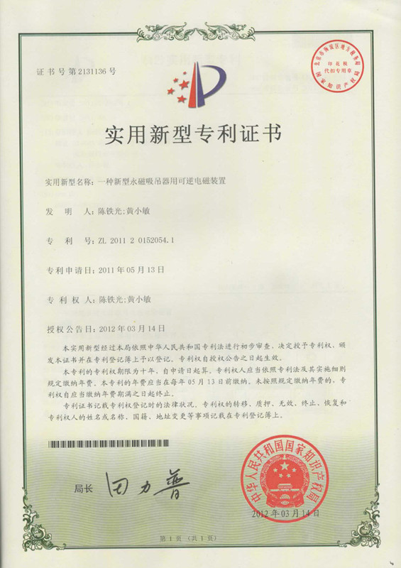 2012年03月14日,1由我公司技術(shù)中心自主研發(fā)的“一種新型永磁吸吊器可逆電磁裝置"獲得國(guó)家實(shí)用新型專利授權(quán)。近年來(lái),我公司一直高度重視新產(chǎn)品研發(fā)和新技術(shù)應(yīng)用,強(qiáng)化知識(shí)產(chǎn)權(quán)管理,實(shí)施專利戰(zhàn)略,以為市場(chǎng)提供專業(yè)化的產(chǎn)品和技術(shù)服務(wù)。